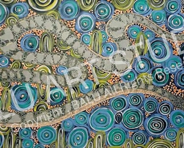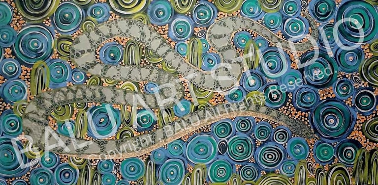 This large acrylic painting on canvas (82 cm × 176 cm) is inspired by the rare Mangrove Snake (Myron resetari), found only in the mangrove habitat of Roebuck Bay, Broome.
